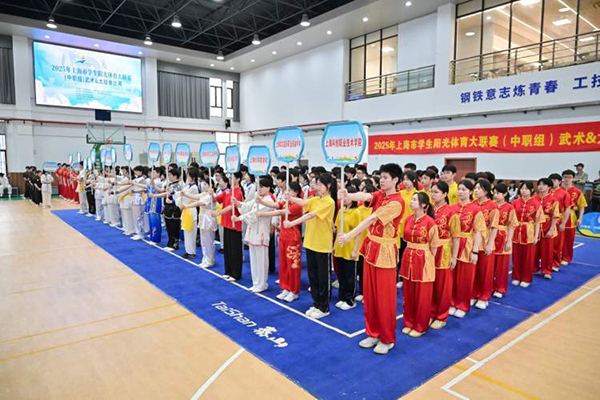 近日,2025年上海市学生阳光体育大联赛中职组太极拳、武术比赛在上海市工业技术学校隆重举行。来自全市中职学校的15支武术队伍和11支太极拳队伍,400余名选手齐聚学校体育馆,展开三段长拳、武术操、太极拳的激烈比拼。