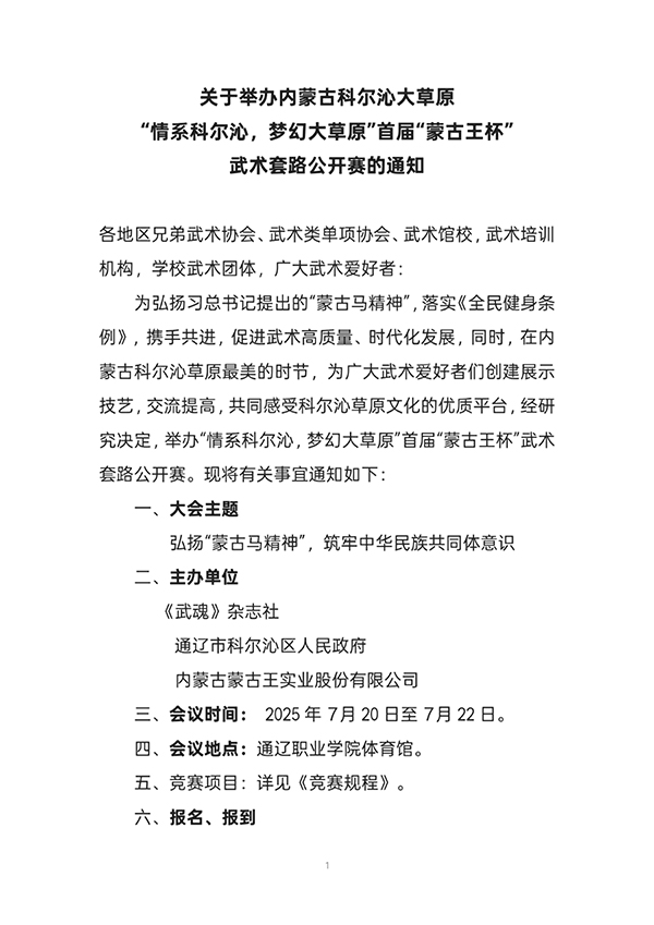 “情系科尔沁,梦幻大草原“首届“蒙古王杯”武术套路公开赛的通知