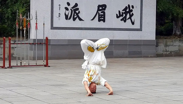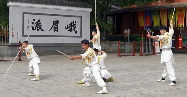 考察团抵达基地时,首先观看了专业团队在峨眉派照壁前的武术展演。