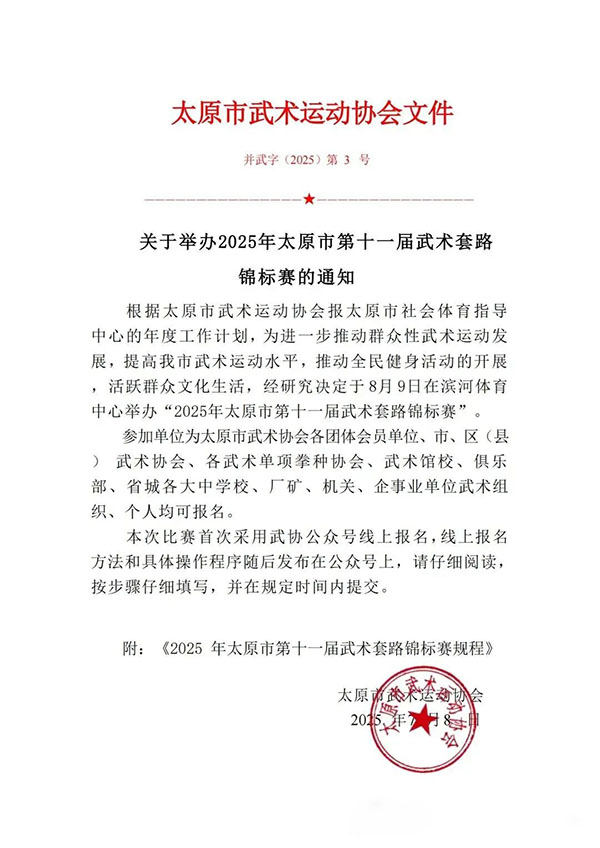 2025年太原市第十一届武术套路锦标赛将于8月9日在太原市滨河体育中心A馆举行。7月10日至23日线上报名快来参与!诚邀武术爱好者报名参赛展现技艺风采!