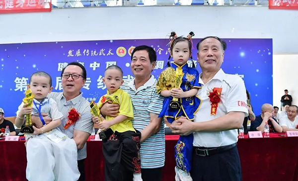 赵安利、宋斌、肖关记为宝鸡龙武拳馆彭浩桐,马超武术运动中心田佑,锦龙汇武术馆王彬茹三个年令最小的参赛队员颁发武童奖奖杯。