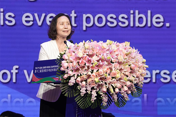 张玉萍秘书长代表第十二届亚洲青少年武术锦标赛组委会,向莅临赛事的嘉宾、运动员等致以热烈欢迎。她说,武术蕴含崇德尚武、自强不息的精神,契合奥林匹克理念,是文明交流互鉴的重要载体。本次赛事为亚洲青少年搭建高水平竞技与文化交流平台,助力其在拼搏中诠释坚韧、在交流中传递友谊。衷心祝愿运动员赛出佳绩、收获友谊,祝赛事圆满成功!