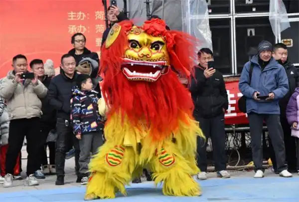 2月12日,农历正月十五元宵节,山东省鄄城县郑营镇冯庄生态园举行“闹”元宵活动。舞狮在紧密的锣鼓声中来到了舞台中央,表演者用高超的技巧和良好的身体协调性,灵活地操控狮头和狮尾,展现出狮子的各种神态。