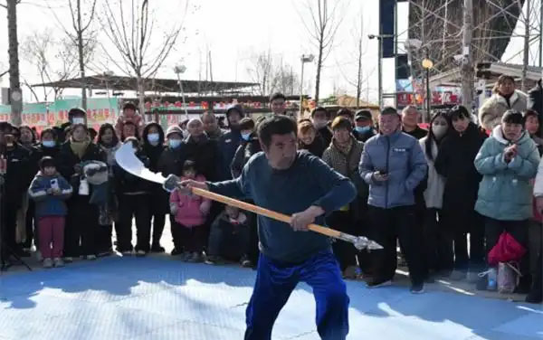 “除了传统的武术个人展示和武术套路对打,我们还准备了硬气功、舞动百斤大刀、麒麟鞭等特色武术项目以及舞龙。”郑营镇杨胡同武术班负责人张敬才介绍,杨胡同村自古就有群众性练武的习惯,以舞狮技艺、二洪拳出名。杨胡同武术、舞狮起源于清末时期的战乱时代,村民为保家卫国、强身健体,自发开始习武,并一直沿袭至今。“我们每年元宵节都会举行舞狮、武术‘闹’元宵活动,在丰富群众精神文化生活的同时,也将我们的舞狮和武术发扬光大。”张敬才说。