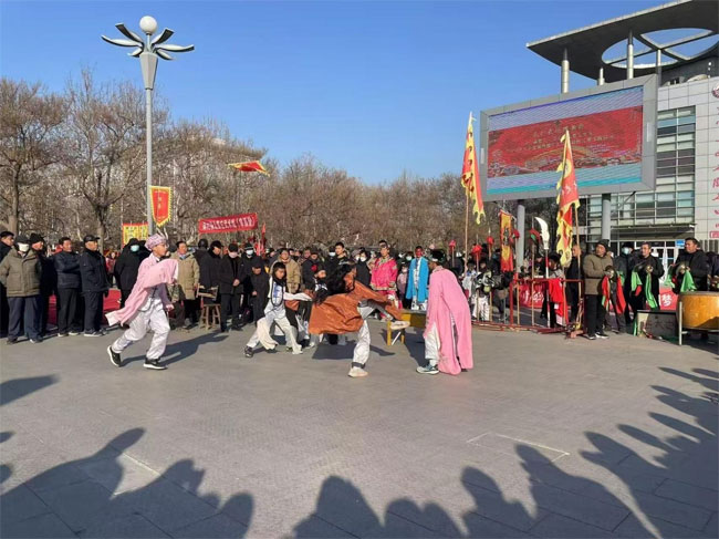 2月9日(正月十二),肃宁县文化艺术中心广场上,一出精彩的武术戏《燕青打擂》正在上演。层层人群围绕之下,场内鼓声隆隆,喝彩声此起彼伏,“小演员”们擦掌亮剑,闪转腾挪,套路拳脚,场面热火朝天。