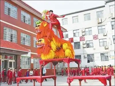 马步稳如泰山、弓步疾如闪电……2月19日,记者在鹅坡武校看到,伴着铿锵鼓乐,两只身披金黄毛发的“狮子”时而挪步、时而腾跃,在引“狮”少年的带动下迅捷窜上1.6米高台娴熟倒立、空翻,引“狮”少年同时做出踺子后手翻接后空翻动作。双方配合默契,将北狮的威武灵动、刚柔并济展现得淋漓尽致。
