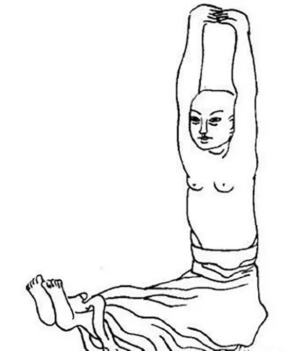 原注:放所盘两脚,平伸向前,两手指相叉,反掌向上,先安所叉手于头顶,作力上托,要如重石在手托上,腰身俱著力上耸。手托上一次,又放下,安手头顶,又托上,共九次。(图9)。