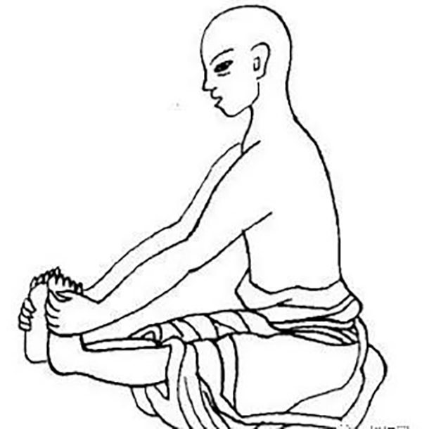 原注:以两手向所伸两脚底作力板之,头低如礼拜状,十二次;仍收足盘坐,收手握固。(图10)。
