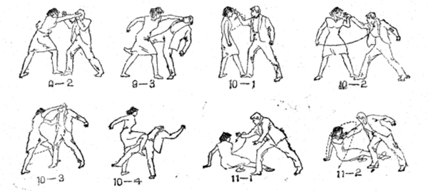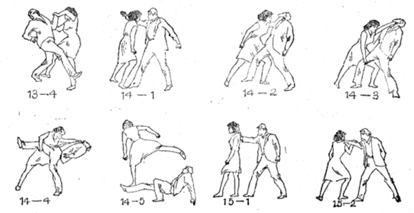 歹徒伸右手向我扑来,我则待其手将到之时,突然向右一闪,使其来手抓空(图14一1)。不持他把手收回,我即用左小臂迅速迎击其咽喉。左脚同时上步于他前腿之后。如图14一2所示。