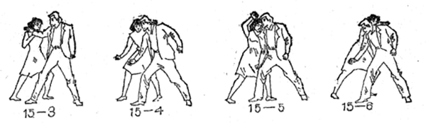 上动不停,左脚借拧身转体之势,扣上一步,脚置于他右腾后方。我右手继继将其臂向外推挡。如图15一3所示。