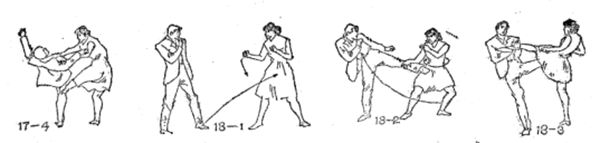 身体迅速左转,右手由对方腋下穿到胸前,右脚尖勾紧的踝颈部由后向前上方勾躅对方左脚,右手同时向右后反向一别,歹徒将向后摔倒。(如图17-2)。