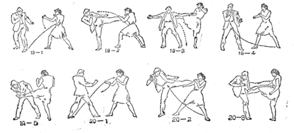 歹徒侧身插步,一般可能发腿,此时我可做好拍腿准备。如图19一1.